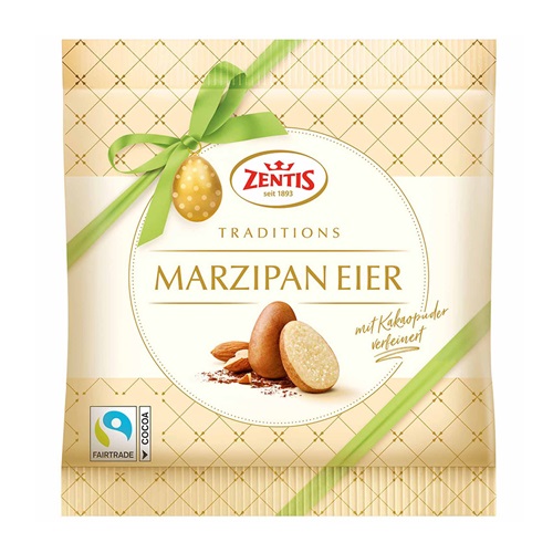Marcipánová vejce vyrobená z lahodného marcipánu s příjemně intenzivní chutí a jsou korunována jemnou vrstvou tmavého kakaového prášku.